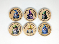 Zestaw 6 sztuk kolorowych drewniaków z grafikami Gnomów.