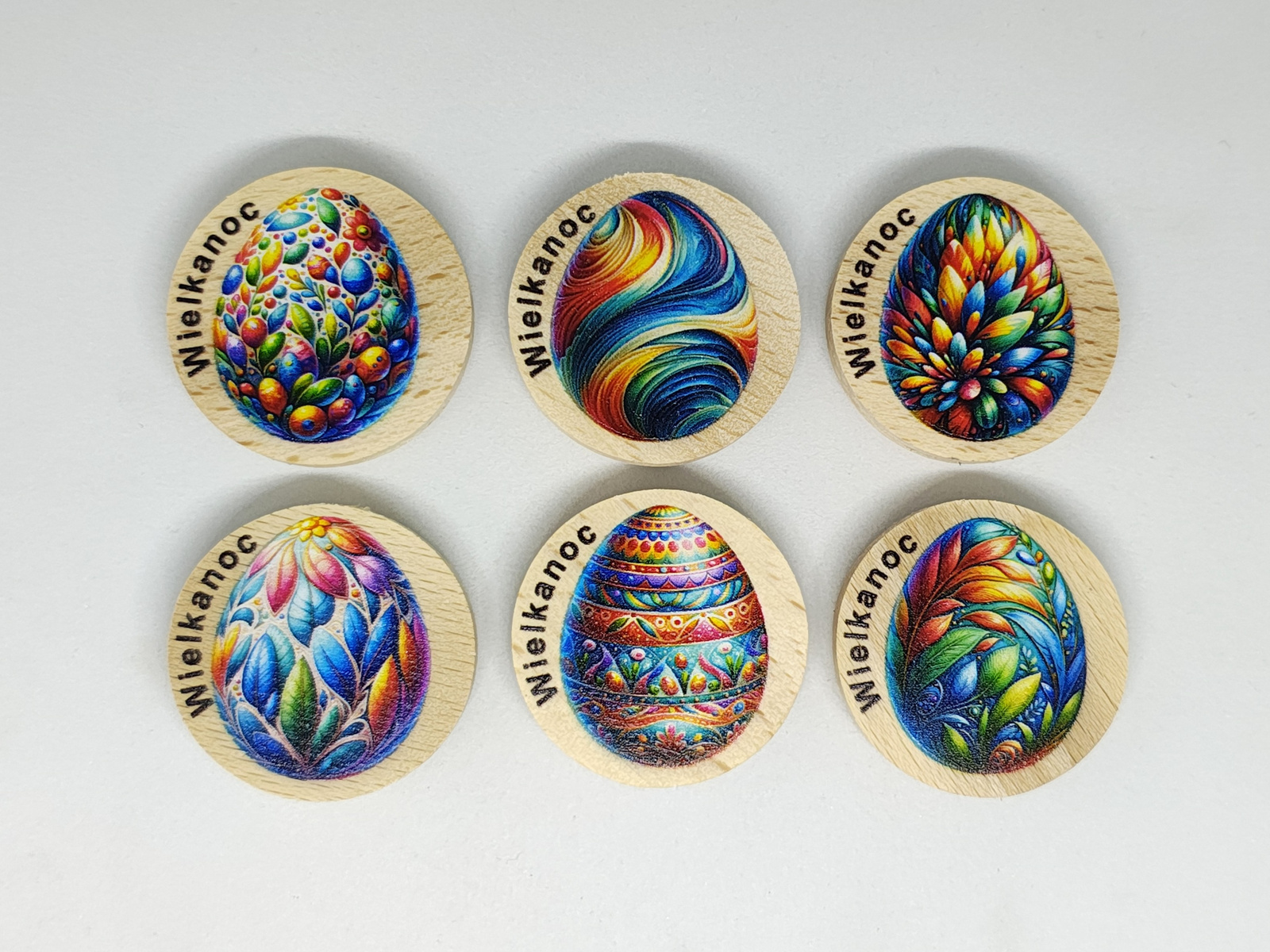 - Zestaw 6 kolorowych drewniaków z grafikami pisanek.